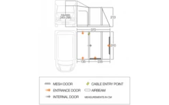 In jeder Seitenwand befindet sich eine Tür, ein Fenster oben und eine Lüftungsgaze mit Folienabdeckung unten. Zusätzlich kann eine große Hochentlüftung per Reißverschluss geöffnet werden. Dies ermöglicht eine optimale Luftzirkulation. Beide Seitenteile lassen sich, dank Reißverschluss, an heißen Tagen schnell herausnehmen oder zu einer Verandalösung abklappen.